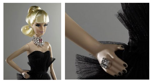 Ela foi desenhada por Stefano Canturi, e seu preço é nada mais nada menos do que 500.000 dólares, se você está pensando que leu errado saiba que não é isso mesmo Quinhentos Mil Dólares, e seu preço está quase todo concentrado em seu pescocinho, são 3 quilates de diamantes e arrematados por um diamante raríssimo e rosa, que retém o maior valor dentre todos os outros diamantes, e na mão direita ela também exibe um belo anel de diamantes, haha... é a Barbie mais sofisticada, e ela mesmo sendo uma boneca tem mais diamantes do que muitas mulheres reais do mundo, incluindo euzinha, rsrsrsrsrs....